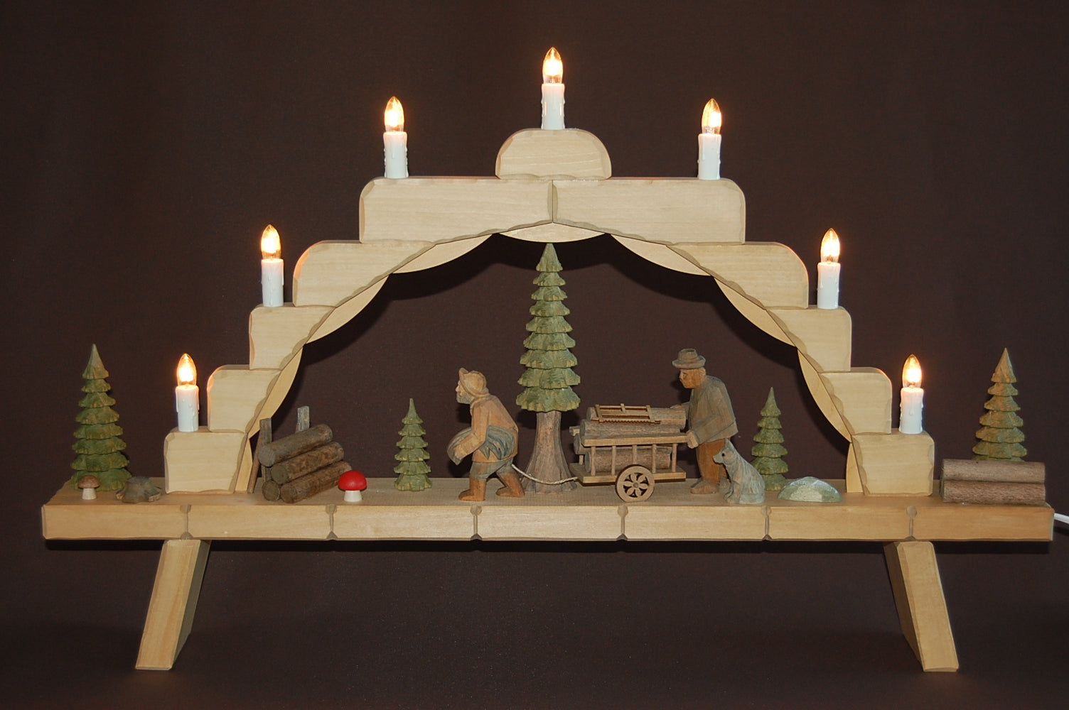 geschnitzter Schwibbogen Holztransport 7-flammig , ca. 71 x 44 cm